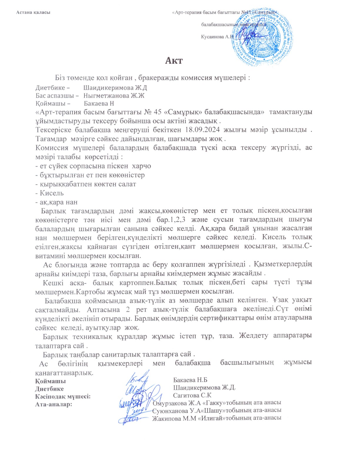 2024 жылы 18 қыркуйек куні балабақшамышда Ата - аналар мүшесінен құрылған брокеражды коммисия балабақшамызда асханасында дайындалатын барлық тағамдар мен аспаздық өнімдер олардың дайын болуына қарай міндетті түрде тексерілді. Тағамдар аса мұқияттылықпен ойластырылып, тамақ пісіру барысы мен дәмінің сипаттамасы үнемі Балаңыздың балалабақшадағы тамақтану тәртібін, үйіңіздегі тамақтану тәртібімен келістіріп алсаңыз, өсіп келе жатқан жас ағзаға керекті дәрумендерді түр - түрімен үйлестіріп бере аласыз. қызметкердің бақылауында болады. Әрбір балабақшада: тамақтың сапасын күнделікті қадағалап отыратын, медбике - диетолог жұмыс істейді. Барлық даналы дайын аспаздық өнімдер, дұрыстығын,"Қанағаттанарлық", деген баға бракераж комиссиясы өзінің бағасын берді.