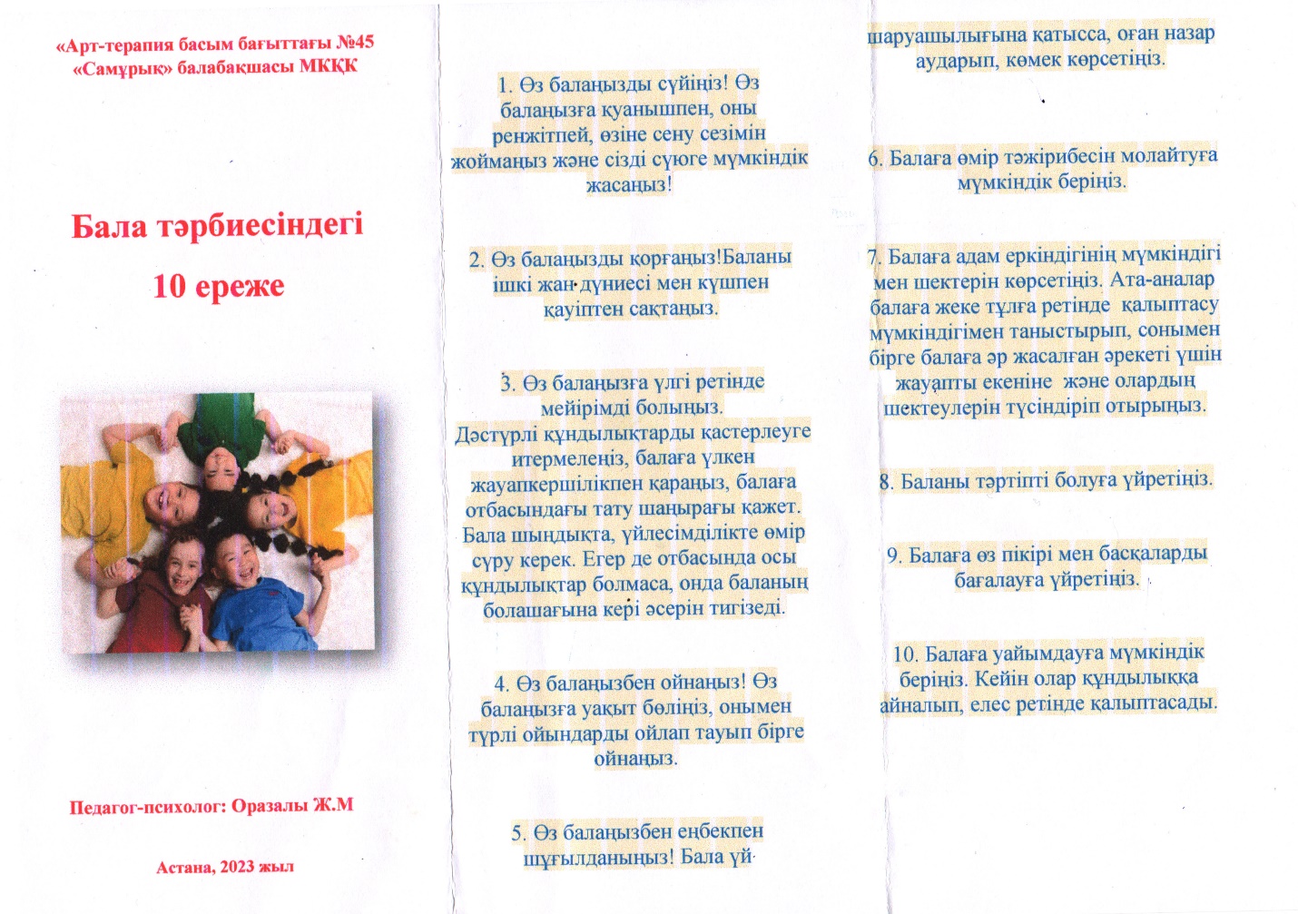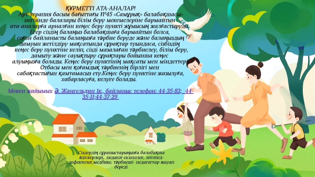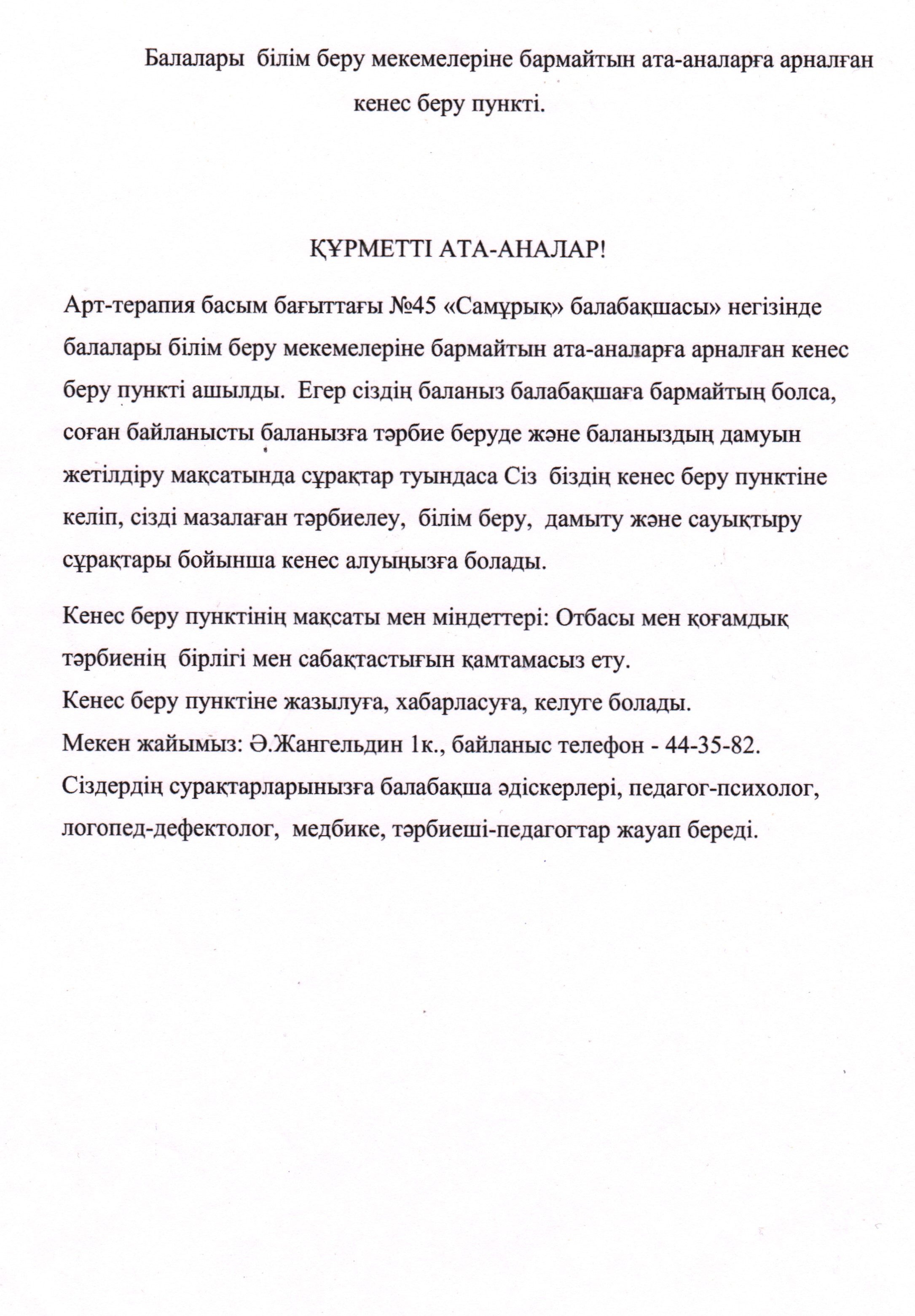 Арт-терапия басым бағыттағы №45 «Самұрық» балабақшасы» негізінде балалары білім беру мекемелерінде, ата-аналарға арналған кеңес беру пунктіжұмысың жалғастыруда. Кеңес беру пунктінің мақсаты мен міндеттері: Отбасы мен қоғамдық тәрбиенің бірлігі мен сабақтастығын қамтамасыз ету.