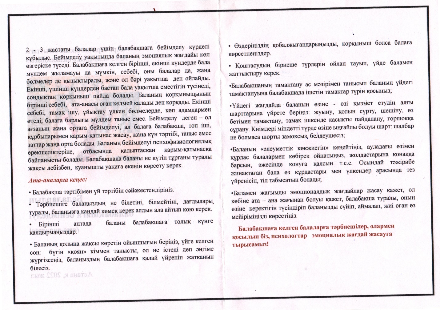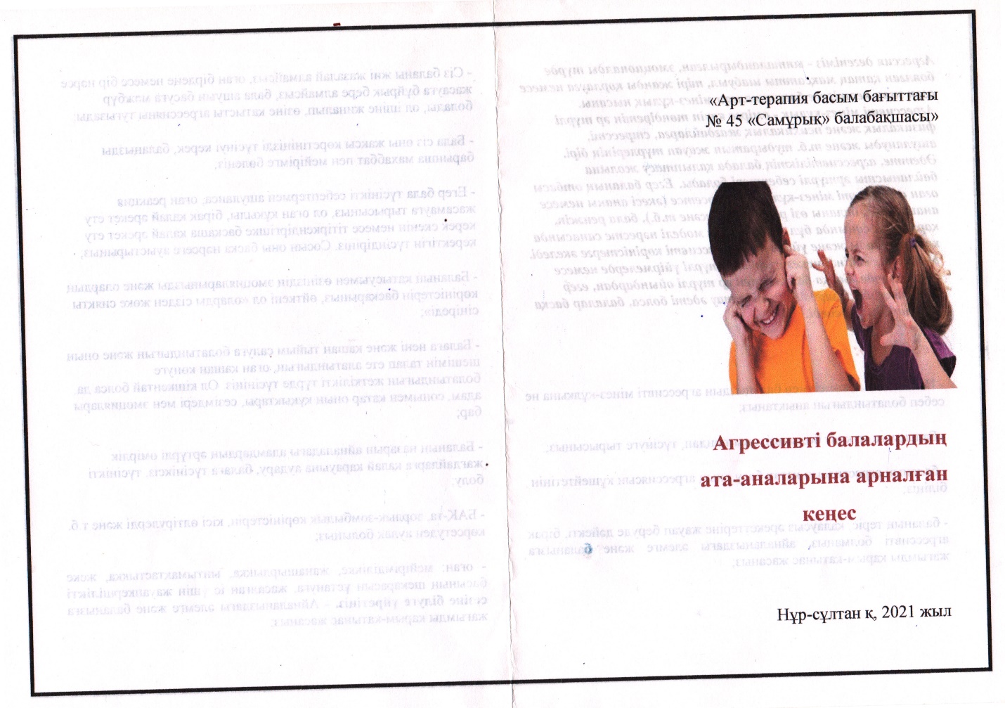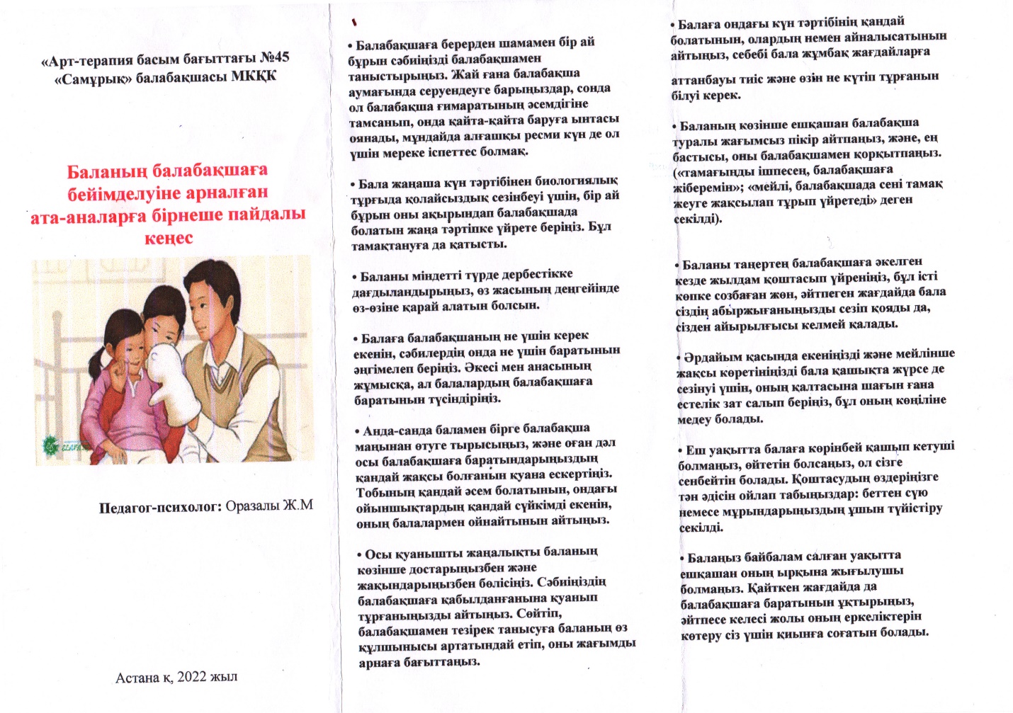 Арт-терапия басым бағыттағы №45 «Самұрық» балабақшасы» негізінде балалары білім беру мекемелерінде, ата-аналарға арналған кеңес беру пунктіжұмысың жалғастыруда. Кеңес беру пунктінің мақсаты мен міндеттері: Отбасы мен қоғамдық тәрбиенің бірлігі мен сабақтастығын қамтамасыз ету.