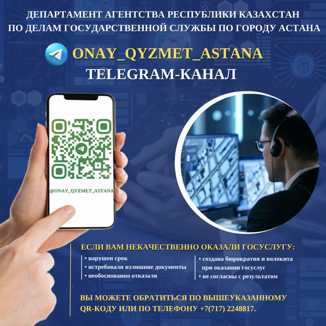 Создан Telegram канал «ONAY_QYZMET_ASTANA» для возможности сообщения вопросов и проблем, возникающих при получении государственных услуг, а также их оперативного решения.