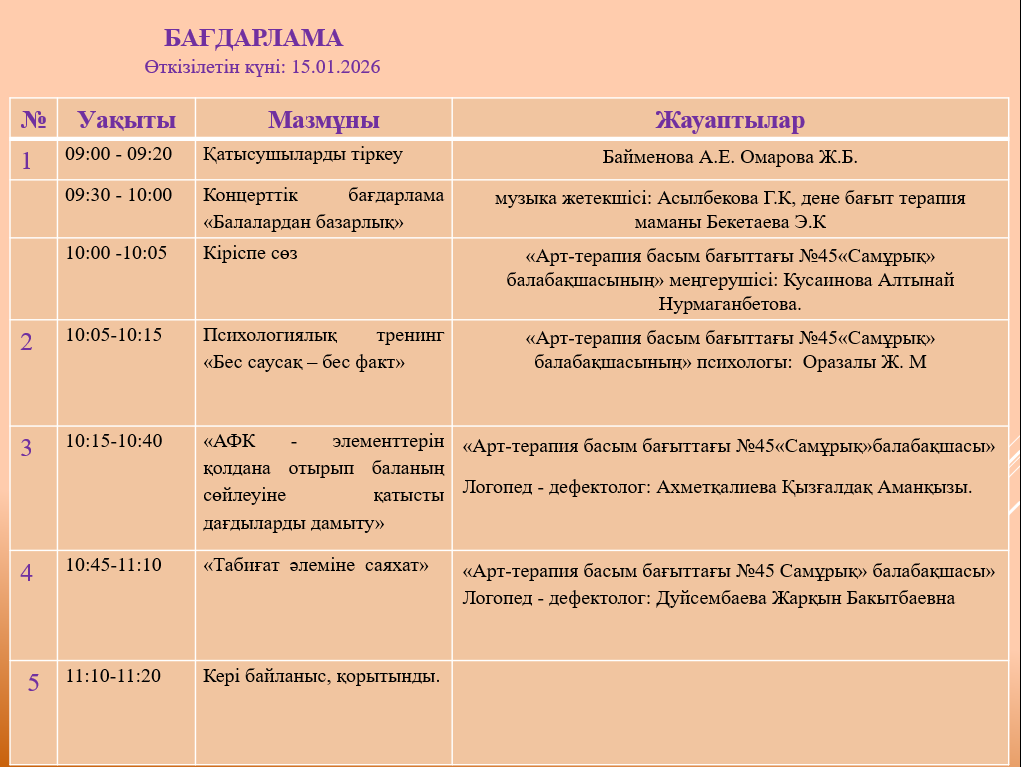 Қайырлы күн! 15.01.2026 ж. «Арт терапия басым бағыттағы №45 «Самұрық» балабақшасында МКҚК «Инклюзивті білім беру педагогтері қауымдастығының жұмысы аясында мектепке дейінгі логопед, дефектолог арнайы педагогтерінің ашық ұйымдастырылған іс-әрекеттері» атты қалалық семинар ұйымдастырылды. Балабақшада психолог, логопед, дефектолог, тәрбиеші педагогтар өз іс тәжірибесімен, келесі инновациялық әдіс-тәсілдермен бөлісті: педагог - психолог Ж. Оразалы келген педагогтермен психологиялық «Бес саусақ-бес факт» атты тренингін өткізді. Логопед - дефектолог Қ. Ахметқалиева өз ҮІӘ жұмысымен таныстырды. «Адаптивтік дене шынықтыруды қолдана отырып,баланың сөйлеуіне қатысты дағдыларды дамыту» білімін қалыптастыруға арналған көрнекі материалдар қолданды. «Пирамида Шелленберг» арқылы:
