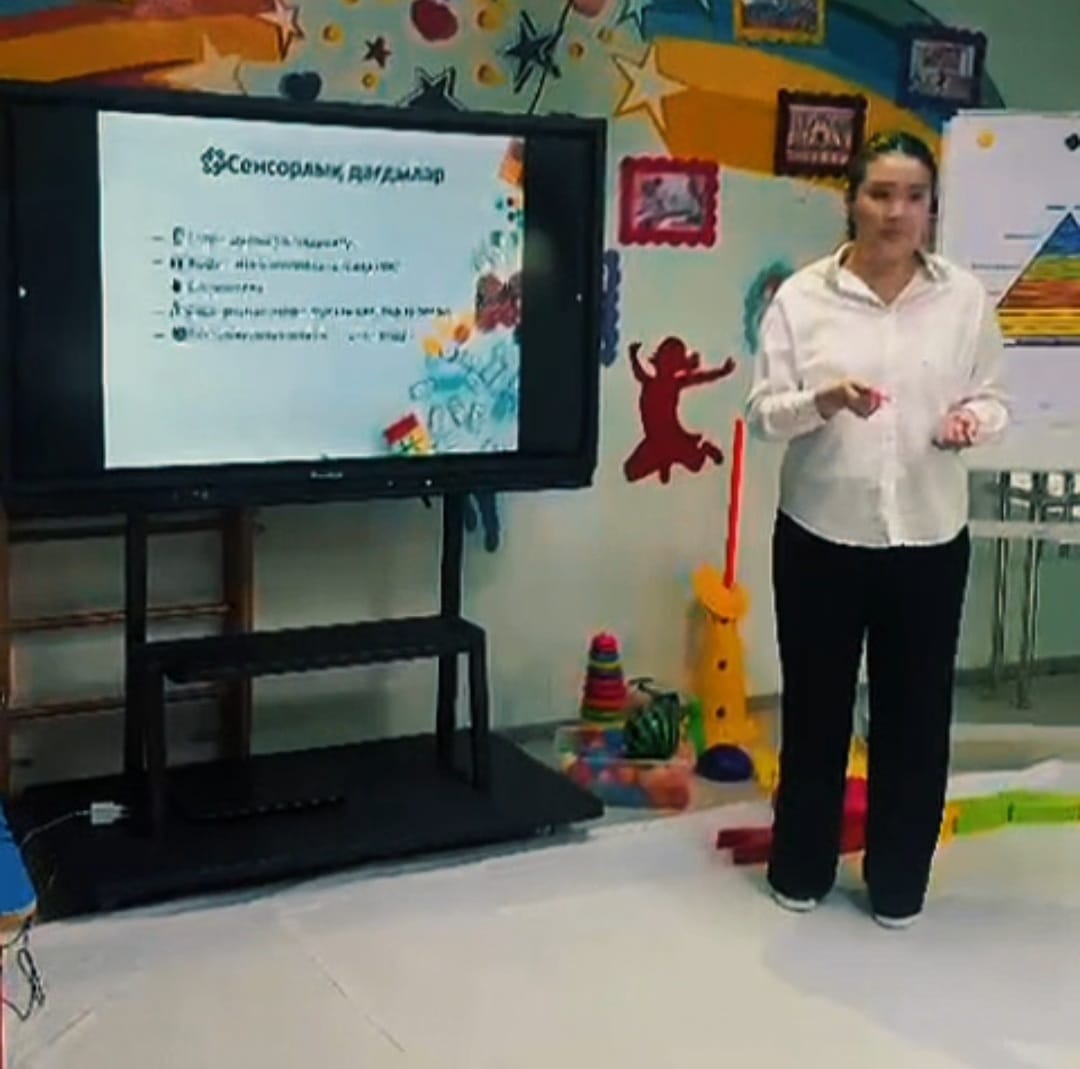 Қимыл-қозғалыс жаттығулары кезінде бала жаңа сөздерді меңгеріп, нұсқауларды тыңдап, орындауға үйренеді. Бұл өз кезегінде пассивті және активті сөздік қордың дамуына ықпал етеді. Келесі логопед - дефектолог Ж.Дуйсенбаева ҮІӘ тақырыбында «Табиғат әлеміне саяхат» интерактивті еден арқылы Интерактивті видеоэппинг түрінің бірі «Интерактив» орталық балалар едендегі интерактивті ойындар ойнайды. Қозғалыстар, дыбыстар, мультипликация баланың назарын аударын, оның танымдық белсенділігін жетілдіреді. Проекциялық экранда ойын түрінде таныстырылатын мәліметтер балалардың зор ықыласын аударады. Сондай-ақ, семинар барысында ашық оқу іс-әрекетімен қоса шебер сыныптар өткізілді және топтардың заттық дамытушы ортасымен таныстырылды.