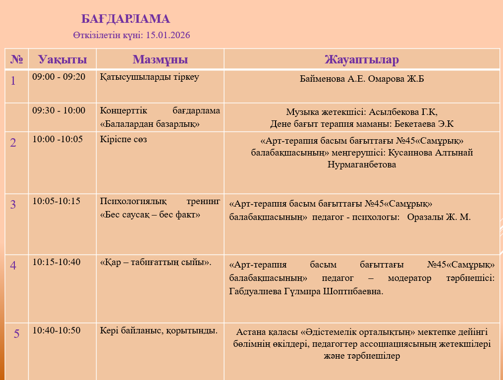 15.01.2026 ж. «Арт терапия басым бағыттағы №45 «Самұрық» балабақшасында МКҚК мектепалды топ тәрбиешілерінің ашық ұйымдастырылған іс-әрекеттері» атты қалалық семинар ұйымдастырылды. Балабақша психолог, логопед, дефектолог, тәрбиеші педагогтар өз іс тәжірибесімен, инновациялық әдіс-тәсілдермен бөлісті: педагог - психолог Ж. Оразалы келген педагогтермен психологиялық «Бес саусақ - бес факт» атты тренингін өткізді. Мектепалды топ тәрбиеші- педагогі Г. Ш. Габдуалиева «Қар – табиғаттың сыйы» мақсатында Балалардың қыс мезгілі туралы түсінігін кеңейту, Қардың қасиеттері туралы түсінігін кеңейту, тәжірибе арқылы ойлау қабілетін дамыту және балалармен зерттеу жұмыстары жүргізіліп, жасанды интеллект арқылы әртүрлі тапсырмаларды орындалды. Проекциялық экранда ойын түрінде таныстырылатын мәліметтер балалардың зор ықыласын аударады.